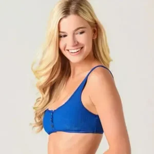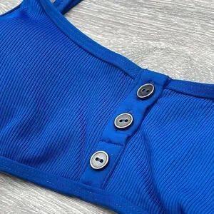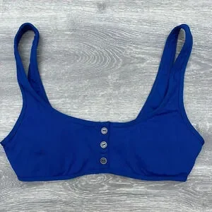 The L Space Women's Ribbed Robbie Bikini Top is a stylized bikini top featuring henley-style functional button-down front and super soft ribbed fabrication, happy beach-ing!