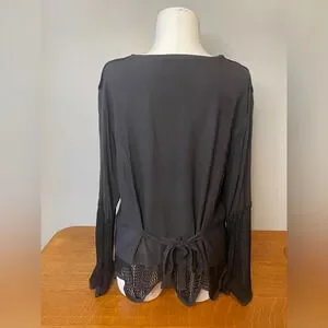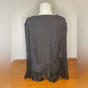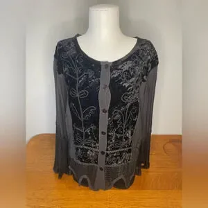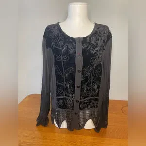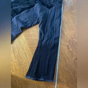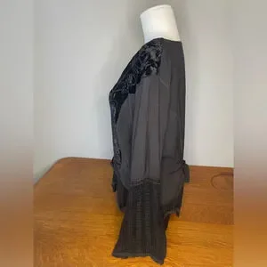 This is a glorious top! Perfect for whimsigoth style. Black with embroidered and mesh details. Long sleeves with mesh, bell sleeve style from elbow. Tie in back. Velvet-y look to fabric on chest/front. Soft and flowy. This is completely tagless so I don’t know size, fabric or brand. Based on measurements, I’m assuming it is a size small or medium; check measurements in photos to determine fit. It has at least 3 different types of fabric in its construction. And hem at bottom is wavy in nature. So many cool attributes to this blouse!!