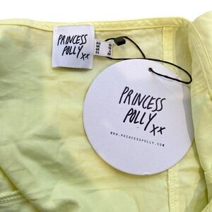 Princess Polly Little Lambs Lace Top In Lemon. Features an open front design, single tie fastening at bust, slim fitting style, lace detailing, non stretch, unlined. 95% polyester 5% elastane. New with tags attached.