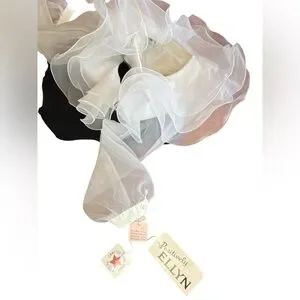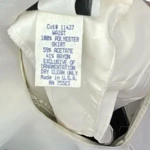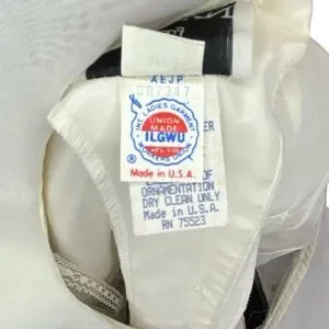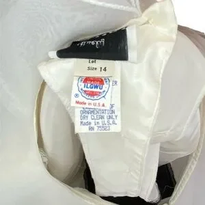 New with tags. Made by International Ladies Garment Workers Union (Union tag attached). Wide v-neck accentuated by soft, flowing ruffles. Long, sheer sleeves. Pearl button details on sleeves and back (top portion). Zipper closure (skirt portion). Split in back for easier movement. No rips, stains, or holes.