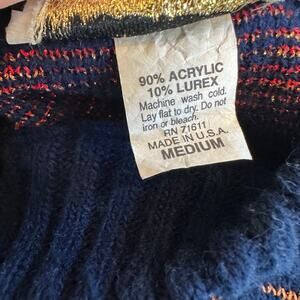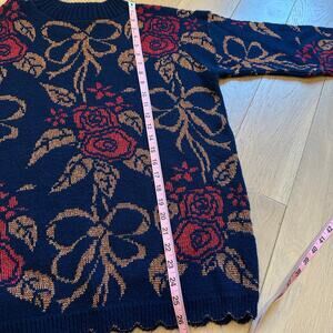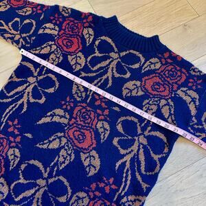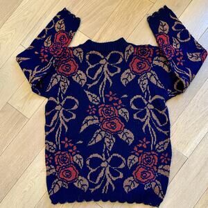 Vintage Dana Scott Christmas Sweater Blue Red And Copper Color Flowers and Bows