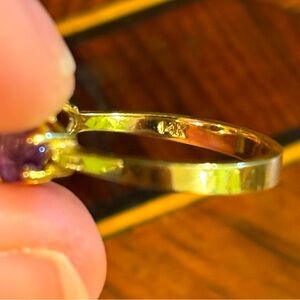 Pre-owned genuine antique 14K gold ring with a beautiful emerald-cut amethyst center stone, side amethysts, and six round brilliant cut diamonds firmly set between. Rarely worn, in like-new condition, size 6.25 US.
