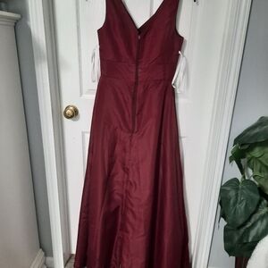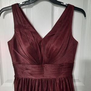 This stunning burgundy evening gown is perfect for any formal occasion. Its elegant design and rich color make it a standout choice. size small. floor length. more of a shimmery burgundy than glittery. there are no size tags on the dress, but I wear a medium/8 and I would say this fits like a small 4/6 as I couldn't zip it all the way and still be able to breathe. fully lined inside with back zipper and front leg slit.