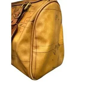This ALVIERO MARTINI CLASSE WORLD MAP BROWN BOSTON BAG is a designer satchel/top handle bag featuring the brand's signature world map pattern in brown canvas and leather exterior. It is accented with gold hardware and showcases Italian craftsmanship. Perfect for women who appreciate high-end fashion and unique designs, this bag combines style and functionality for everyday use or special occasions.