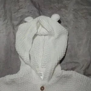 Beautiful, soft white 100% cotton button up jacket for baby girl or boy. Has adorable little ears on hood. Medium weight, breathable and warm for your little one.