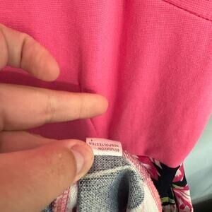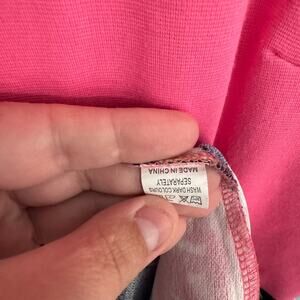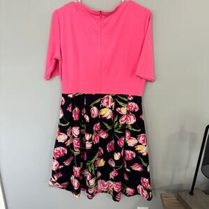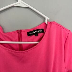 Oxiuly Fashion Pink Floral Swing Dress in women's Size XL. Zipper back. Short sleeves. Bottom portion background color looks like a very dark navy blue in some light and black in others. Dress is in good used condition with no flaws or stains other than some minor wash wear. Please see close-up pictures for condition details. Pit to pit measures approx 19.75 in across, waist approx 17 in across, hips approx 24.75 in across, length from top of front shoulder to bottom hem measures approx 40.25 in. Rayon & Polyester Blend.