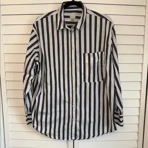This casual button down shirt features a classic design with prominent vertical stripes in black and white. The crisp fabric offers a polished look, making it suitable for both business settings and casual outings. Gently used, excellent condition, washed and cared for.