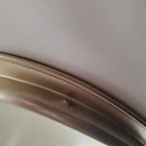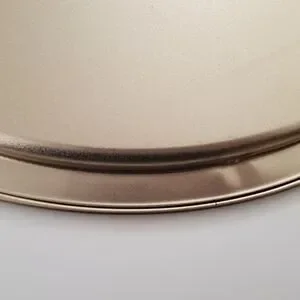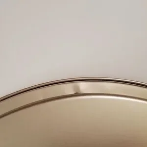 Has a couple dents along the rim, as well as manufacturers indents on the inside of tray.