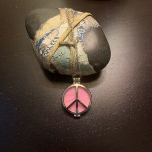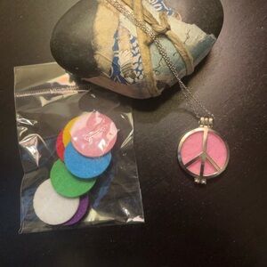 Beautiful silver peace sign opens up to insert colorful pad saturated with your favorite essential oil. Take the vibe with you. Comes with extra colorful pads. Opens easily with secure latch. 1-1/2” pendant with 10” chain.