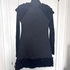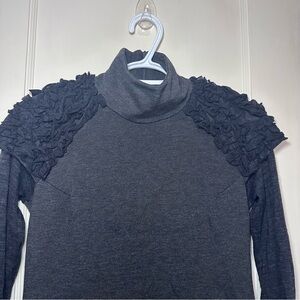Tenax Charcoal Mock Neck Dress, Black Ruffle Details, Long Semi-Sheer Sleeves
