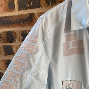 Super G Psycho embroidered logo/skulls graphic zip jacket leather trim, W’s M