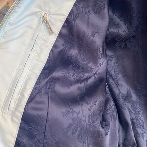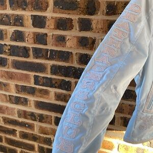Super G Psycho embroidered logo and skulls graphic full zip jacket, leather trim, floral lining, outer zip pockets, inner zip pocket, Seriously such a realy cool stylish jacker, W’s M
