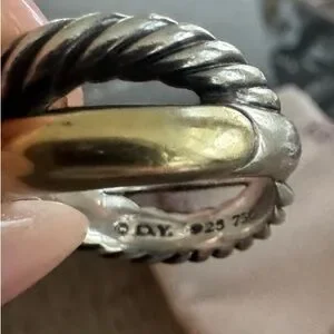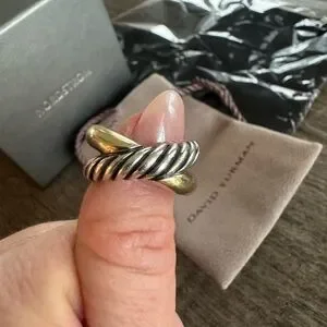 Size 6, worn but great condition David Yurman, sterling and 18k gold crossover ring, heavy and timeless. Paid $550 new. Come with brand new David Truman shine towel, pouch and box