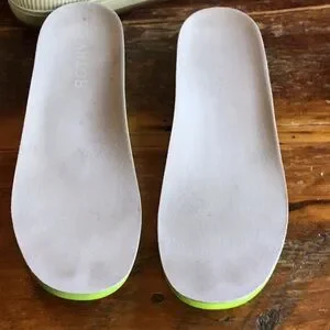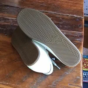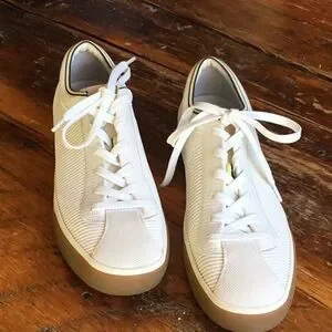 Trendy white sneakers with a sleek design. Features tan soles for a modern look. Perfect for casual wear. Rothy’s Vanilla color lace up sneakers. Only worn indoors to see the fit.