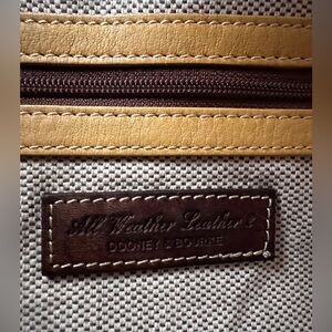 Stylish leather bag by Dooney & Bourke. Features a classic logo design. Perfect for any occasion. One zipper pocket and small regular pocket inside, Brown shoulder strap.