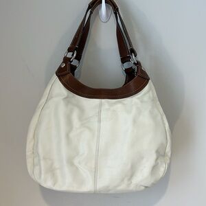Coach Lynn Hobo Large Shoulder Bag Buckle Cream Leather Authentic Purse F15075. This Lynn Hobo bag was made especially for the Coach Factory Outlet stores and was manufactured February 2011. Considering the age, it is in good condition. Light cream or off white leather exterior with a few marks on it, shown in photos. The handles and buckle strap leather have some wear. The inside is in near perfect condition. 3 large pockets with lots of smaller pockets inside. Comes with a dust bag.