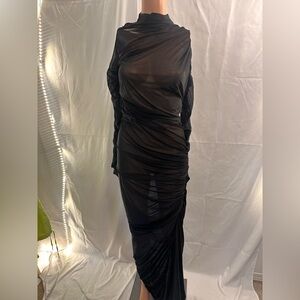 NEW NWT Atlein Hyper Ruched Long Dress in Black FWRD sheer long sleeve bodycon