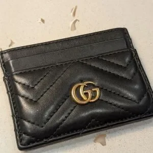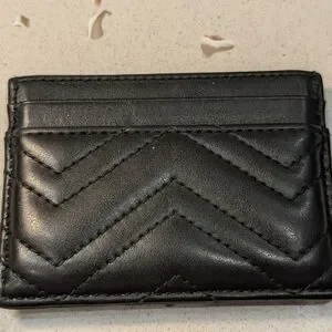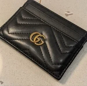 Elegant black leather card holder with gold accents. Perfect for organizing your essentials in style.