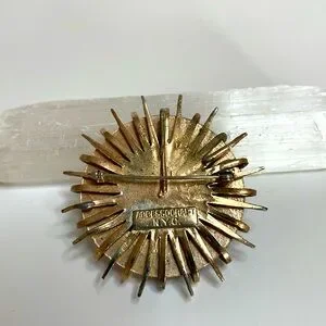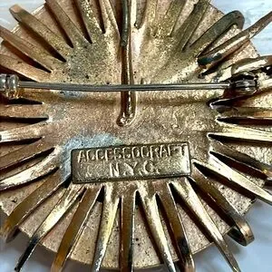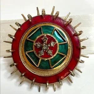 Vintage Accessocraft NYC brooch/pin/pendent round, edged by 16 points and loops. It is Gold tone and enameled with red and green featuring a rhinestone star. It measures 2" in diameter and the pin closure is in good working condition. The center section is slightly off center however is firmly attached. This really is a nice piece of jewelry.