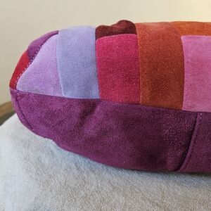 Elevate your style with this vibrant patchwork suede shoulder bag. Featuring a stunning mix of purple, pink, and orange suede patches.