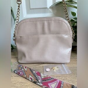 Betsey Johnson Margie Crossbody Tan Purse. Material: 100% vegan leather exterior and 100% polyester floral interior lining with a stylish gold-tone chain strap. This purse features a convenient exterior slip pocket with a zippered top closure and two interior slip pockets with an additional zippered pocket. Beautiful tan shade with Betsey Johnson's signature whimsical floral interior print. This trendy and practical cross-body purse combines chic style with functional organization, making it perfect for everyday use. Pre-loved in excellent condition. Includes a gold mini bag charm and twilly. Smoke-free home.