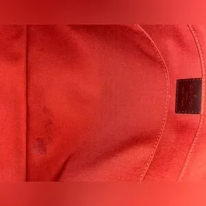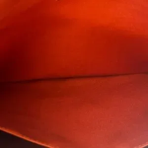 Features brown/black logo print, leather strap, concealed closure and signature orange-red lining.