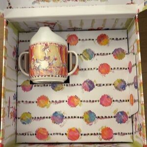 Make mealtime fun with this adorable Mackenzie-Child Animal Parade Toddler’s Dinnerware Set. Includes a BPA-free melamine sectional plate, bowl, and two-handled sippy cup, plus a fork and spoon, all nestled in an extra-special matching gift box with latch closure. A fun gift for baby. Never used!