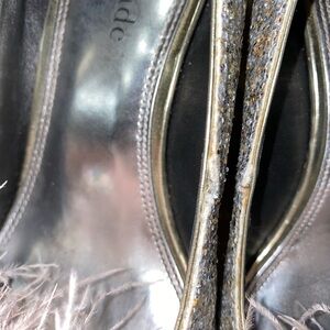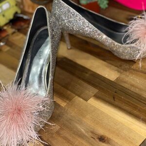 Gently used Kate Spade Marabou Pumps silver and gold glitter with pink feathers