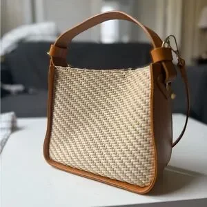 Elevate your wardrobe with this stunning Anna Paola handbag, a perfect blend of natural elegance and modern sophistication. Crafted in Italy, this structured bag features a beautifully woven rattan body framed by rich cognac leather trim, creating a timeless look that effortlessly transitions from city streets to seaside escapes.