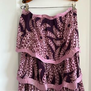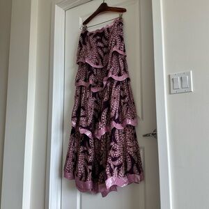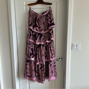 Embrace the essence of tropical elegance with the Burgundy Bananada Midi Dress, a strapless wonder awash in a refined burgundy hue with playful banana leaf patterns. The tiered silhouette is gracefully accented by soft pink trims, adding a touch of whimsy to each voluminous layer. This captivating piece is a celebration of movement and style, offering a breezy grace that promises to turn heads and warm hearts wherever you go.