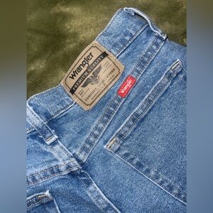 These Wrangler jeans feature a light to medium wash blue denim with a classic straight leg cut. The fabric showcases a typical woven texture with subtle variations in color, adding depth and character.