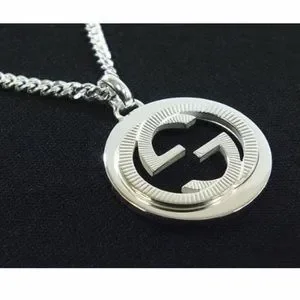 Gorgeous unisex Gucci Sterling silver necklace featuring a high polished interlocking GG groove textured pendant on a curb link chain with a lobster clasp closure.