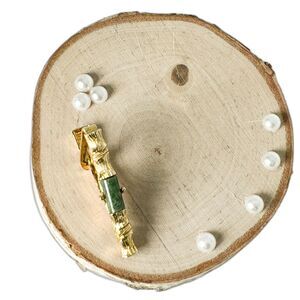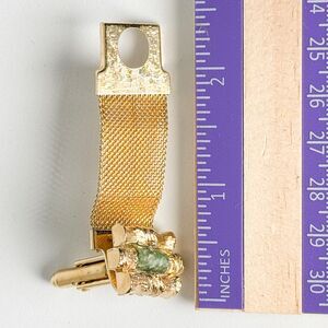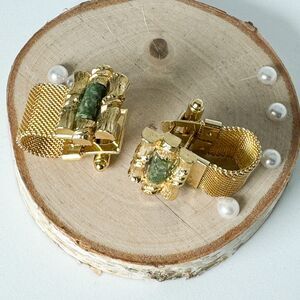 Elevate your accessory game with this stunning vintage cufflinks & tie clip set featuring genuine jade accents. Crafted in a classic gold-tone finish with bamboo stalks, these cufflinks and tie clip add a touch of sophistication to any ensemble. The intricate design showcases the natural beauty of jade stones, surrounded in gold tone bamboo stalks adding a unique Asian and elegant flair to your look. Perfect for formal occasions or adding a stylish touch to your everyday attire. Don't miss out on this timeless set that exudes both style and refinement.
