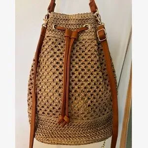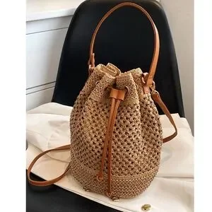 Boho Straw Vegan Leather Strap Bucket Bag