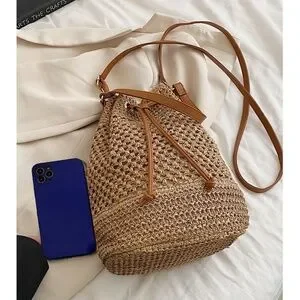 Boho Straw Vegan Leather Strap Bucket Crossbody Bag