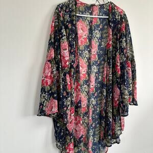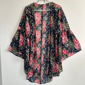Umgee Sheer Floral Print Kimono Bathing Suit Coverup Bell Sleeve Open Front M/L