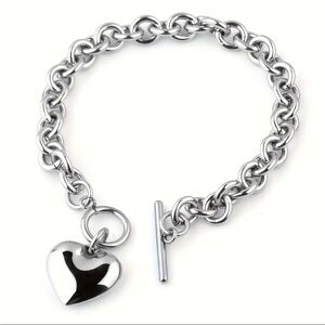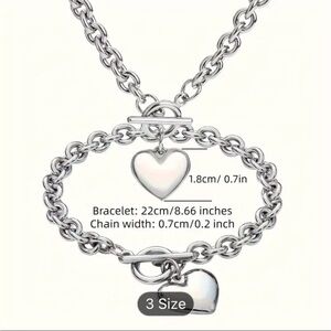 This stunning silver necklace features a unique chunky chain link design with open heart shapes that create a dynamic flow. At its center, a double heart pendant adds a captivating focal point, making it a perfect statement piece. The matching bracelet complements the necklace beautifully, showcasing the same charming heart motif.