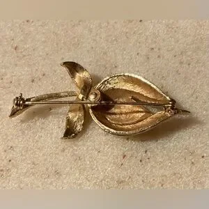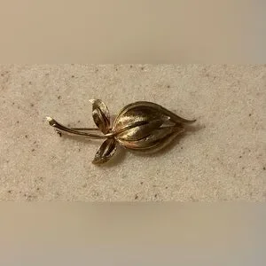 This exquisite gold brooch showcases a beautiful nature-inspired design that resembles a stylized leaf with a slender stem. The polished finish enhances its warm golden hue, making it a striking accessory for any occasion. Its intricate structure features a rounded leaf shape complemented by delicate small leaves, adding a touch of elegance to your ensemble.