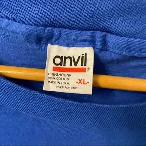 A rare find featuring tribal art by Penny Jackim in 1986. Shirt by Anvil, made in USA single stitch. Blue with white and orange graphics. Light wear. Great vintage condition with some here and there discolouration - mostly some orangey spots which might be from the orange graphics.