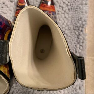 Splash with flash! Pull on these cheery, printed rain boots to ward off the weather blues. Their rubber construction and 10" boot shaft will have you conquering puddles in style. From Nomad Footwear. Flexible outsole. Approximately 1"H heel and approximately 10"H boot shaft. Gently used.