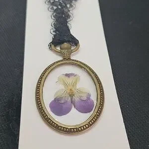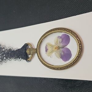 Handcrafted bronze pocket watch pendant featuring a dried viola on vintage lace necklace.