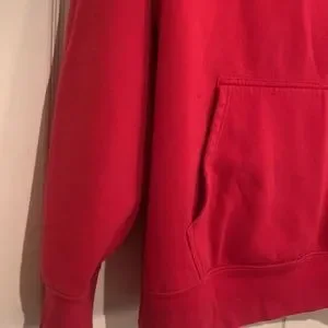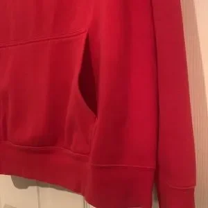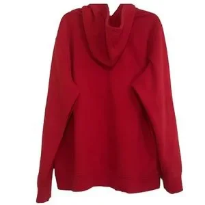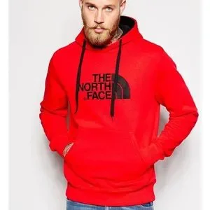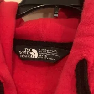 This vibrant red jacket features a prominent hood and showcases the iconic black logo of The North Face. Made from a soft fleece-like material, it offers both comfort and style, making it an ideal choice for casual outings.