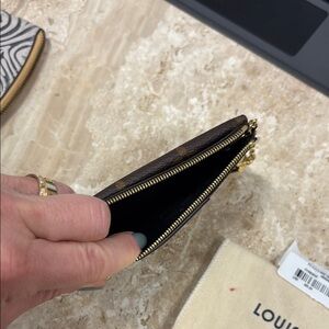 Elegant Louis Vuitton key and card holder. Features classic monogram design. Secure zip closure. Gold-tone hardware accent.