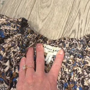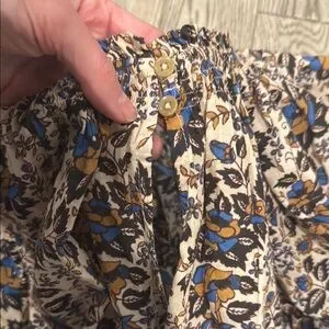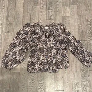 This long sleeve blouse features a charming ruffled neckline and voluminous puff sleeves, creating a romantic silhouette. The intricate brown and white floral pattern adds a vintage touch, making it a perfect choice for a bohemian-inspired look.