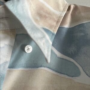 This casual button down shirt features a serene blend of light blue and cream hues, reminiscent of a calm ocean scene. Made from a light, silky material, it drapes softly and is perfect for warm weather. The relaxed fit and short sleeves make it an ideal choice for a breezy summer day.