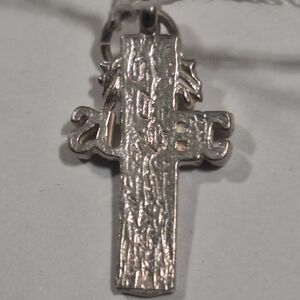 Elegant silver cross pendant with 'Jesus' inscription. Features a detailed design.