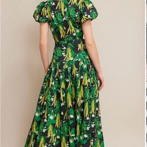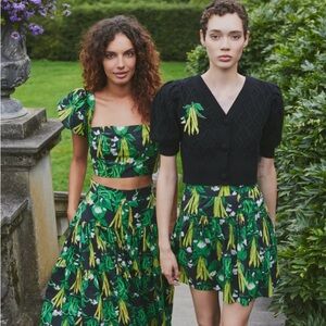 This stylish crop top features a modern square neckline and short puff sleeves, creating a feminine silhouette. The vibrant blue background is adorned with tropical floral patterns in green, yellow, and white, making it a perfect choice for a chic summer look.