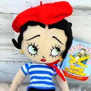 NWT Betty Boop donning French attire as one of the 2012 World Traveller Collection. She has a red satin beret and neckerchief, blue and white striped top, black capris, blue shoes and gold corded loop earrings. She measures 15" in height and is a plush doll. She is in excellent condition and is one of 9 World Traveller dolls. A must have for the Betty Boop fans! Thanks for looking!