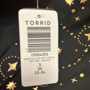 This Torrid black blouse showcases a relaxed boxy silhouette with short sleeves and a rounded neckline. The eye-catching design features a pattern of small white specks that create a striking contrast against the black fabric, reminiscent of a starry night.