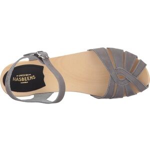These Swedish Hasbeens sandals feature a gray color in nubuck and a stylish clog design with multiple thin straps forming a woven pattern. The adjustable ankle strap ensures a secure fit while the low wooden sole adds a classic touch to your look.